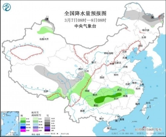 3月6日08時(shí)至7日08時(shí),新疆西北部、西藏北部和東部、青海南部、川西高原等地部分地區(qū)有小到中雪或雨夾雪,其中,新疆西北部等地部分地區(qū)有大雪(5~7mm);新疆西北部、西藏東南部、四川南部、重慶、貴州、云南東部、湖南西北部、湖北西南部等地部分地區(qū)有小到中雨,其中,西藏東南部局地有大雨(25~30mm)。內(nèi)蒙古中部、遼寧、山東半島等地部分地區(qū)有4~6級(jí)風(fēng)(見圖1)。