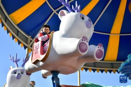 3月3日,在嘉峪關(guān)方特絲路神畫景區(qū),小游客乘坐游樂設(shè)施。