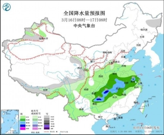 3月16日08時至17日08時,黑龍江東部、新疆沿天山地區(qū)和伊犁河谷、西藏東南部、青海東部和南部、甘肅南部、等地部分地區(qū)有小雪。黃淮西部、江淮、江漢、江南北部、西南地區(qū)東部等地部分地區(qū)有中到大雨,其中,貴州東部、湖南西北部等地部分地區(qū)有暴雨(50~60毫米)。