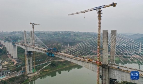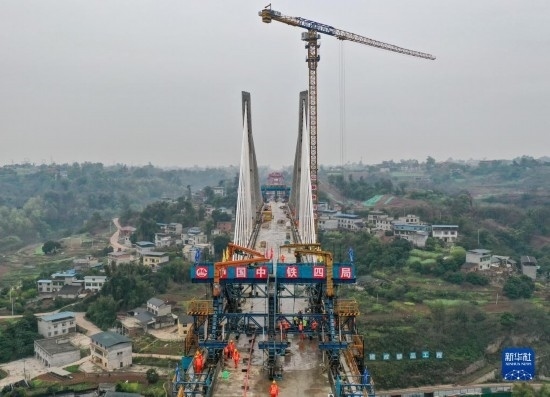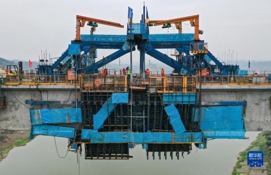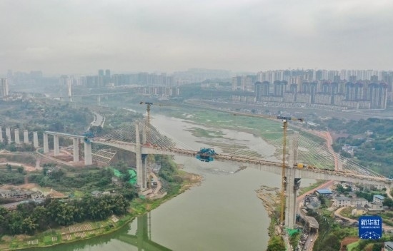 3月18日在位于四川省瀘州市拍攝的渝昆高鐵瀘州沱江特大橋主跨合龍施工現(xiàn)場(無人機(jī)照片)。