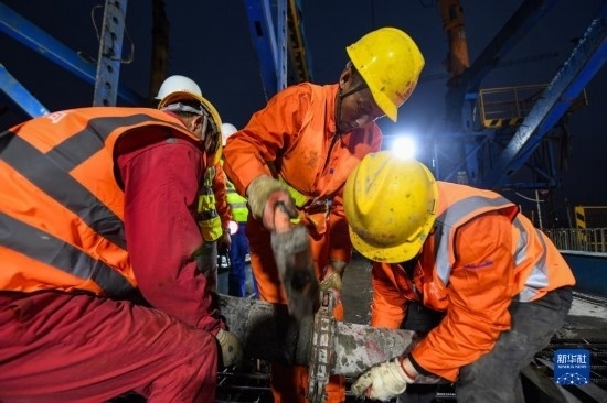 3月18日,在位于四川省瀘州市的渝昆高鐵瀘州沱江特大橋主跨合龍現(xiàn)場,施工人員在進(jìn)行混凝土澆筑。