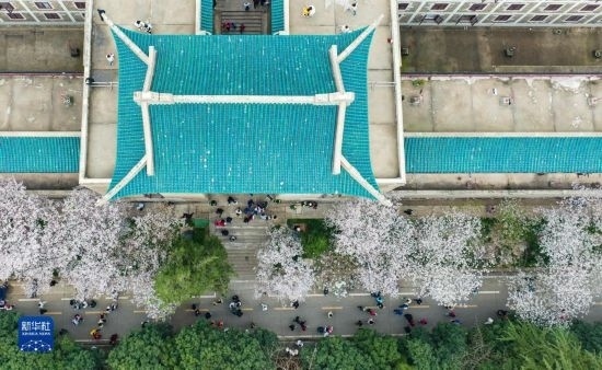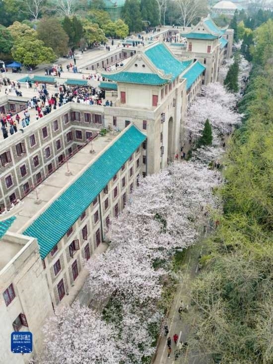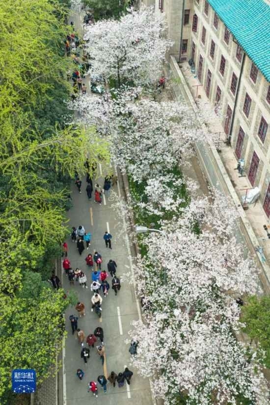 3月18日,來自各地的抗疫醫(yī)護人員及家屬在武漢大學(xué)校園賞櫻(無人機照片)。