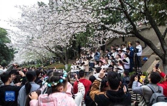 3月18日,武漢大學(xué)海燕合唱團在賞櫻現(xiàn)場演唱歌曲。