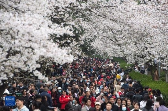 當日,武漢大學(xué)舉行抗疫醫(yī)護賞櫻專場。珞珈山下,來自全國各地的1.6萬余名抗疫醫(yī)護人員及家屬赴約賞櫻。