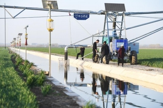 2月28日,在西平縣老王坡高標(biāo)準(zhǔn)農(nóng)田示范區(qū),劉亞輝(右)和王英凡在對平移式水肥一體化噴灌機(jī)進(jìn)行巡檢。