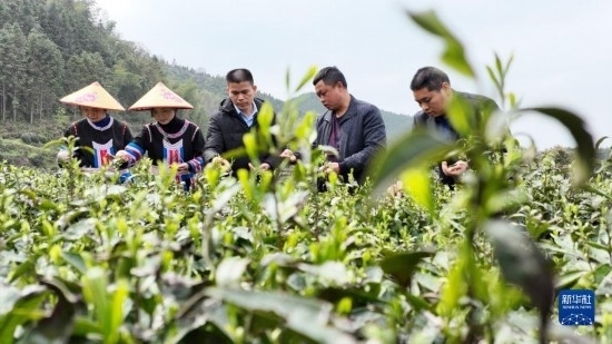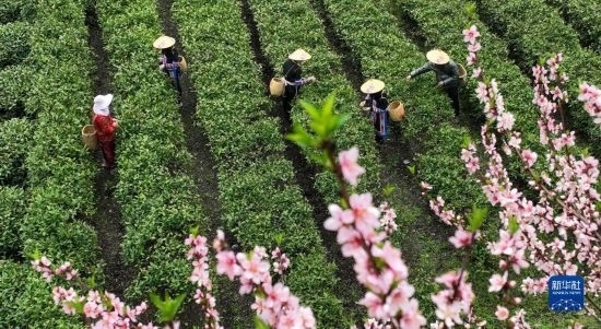 3月20日,在湖南衡陽(yáng)常寧市塔山瑤族鄉(xiāng),技術(shù)人員在茶園指導(dǎo)茶農(nóng)采茶(無(wú)人機(jī)照片)。