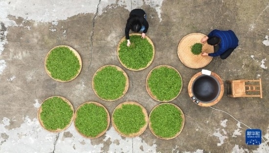 3月20日,在湖南衡陽(yáng)常寧市塔山瑤族鄉(xiāng),茶農(nóng)在炒茶(無(wú)人機(jī)照片)。