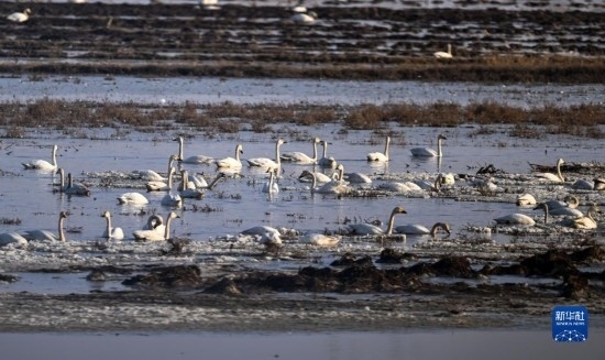 3月20日,在內(nèi)蒙古自治區(qū)呼和浩特市托克托縣黃河沿岸,天鵝在水上棲息覓食。