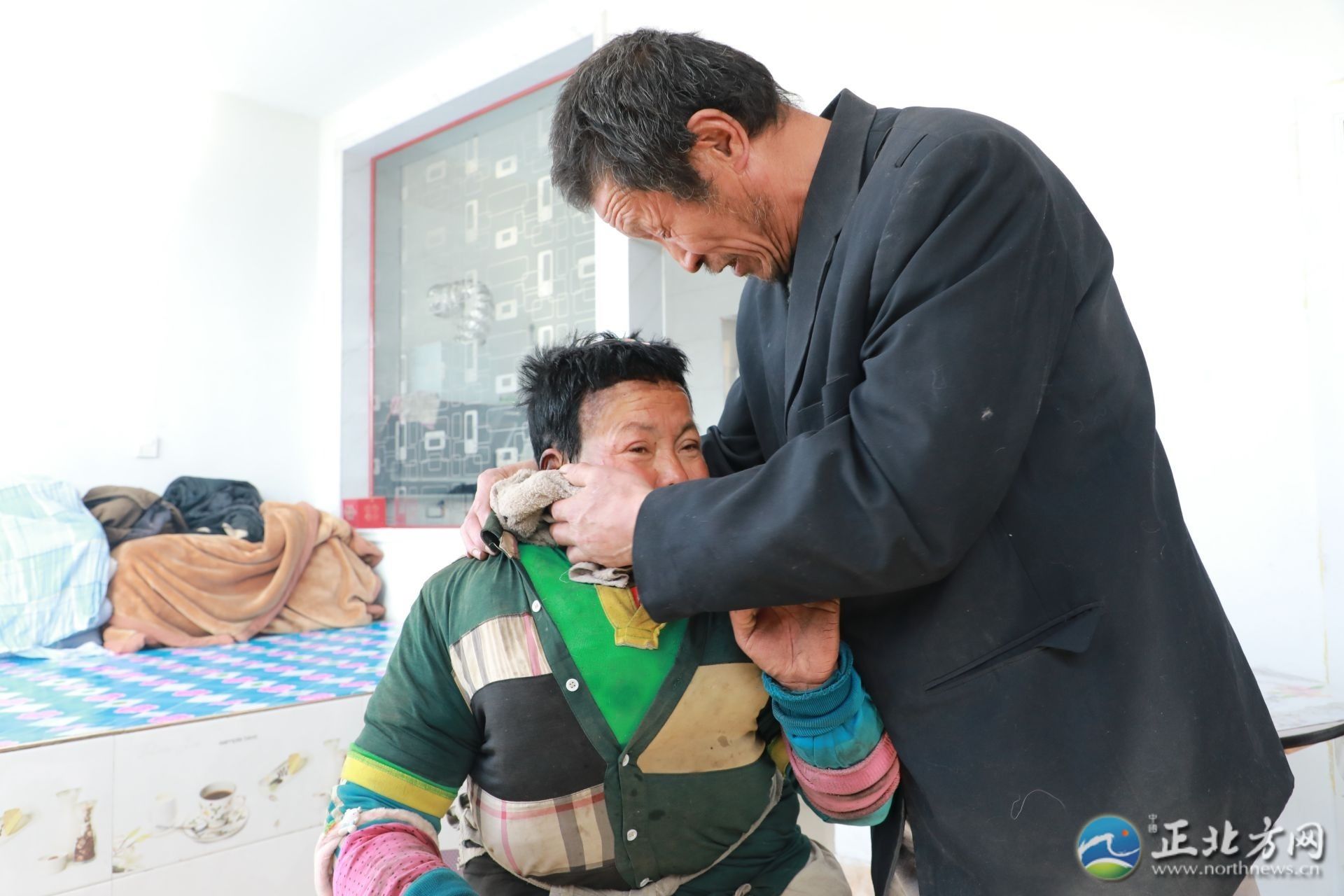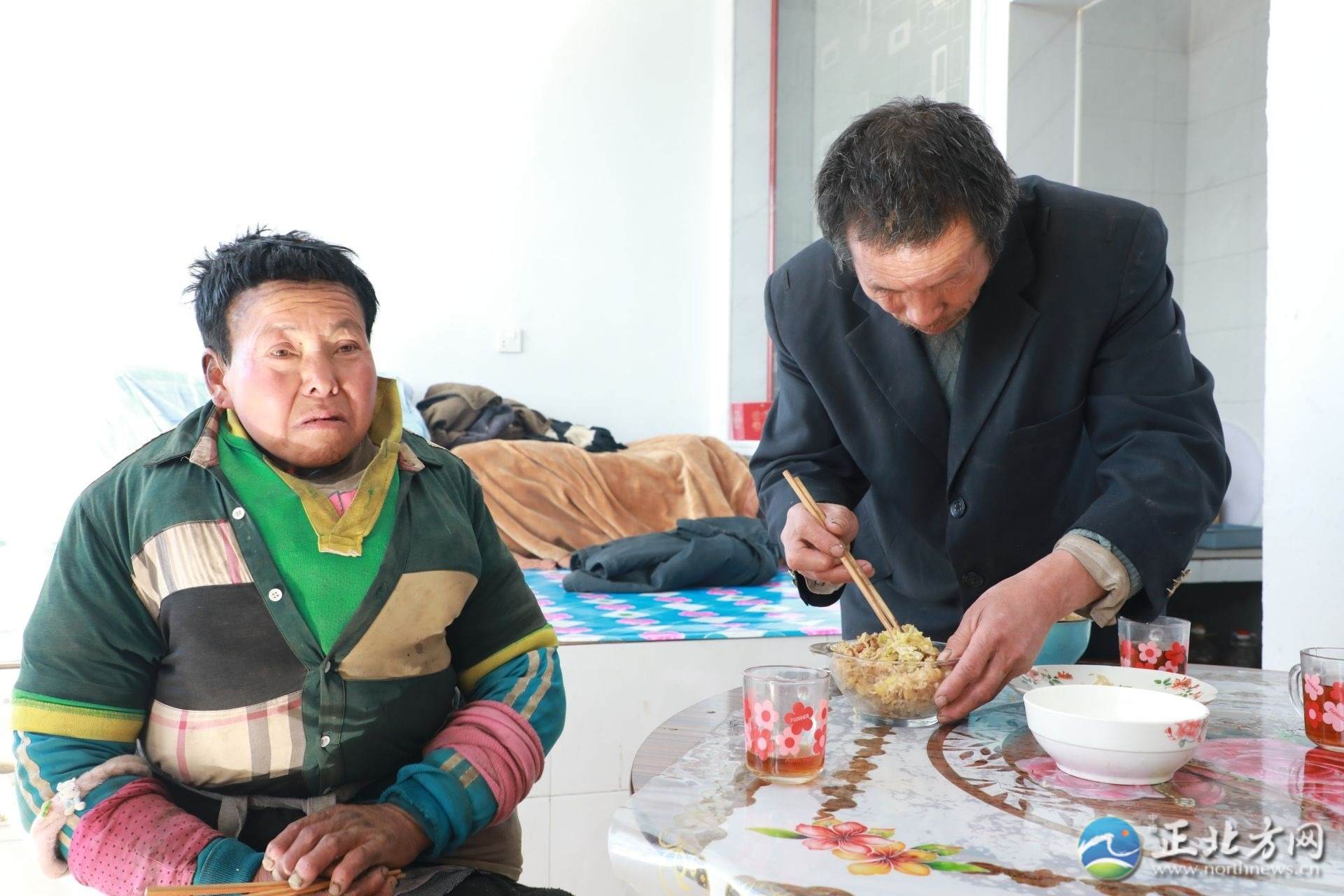 在采訪間隙,何蘭鎖的妻子王林愛回到了家,見到有陌生人顯得很局促。王林愛患有精神疾病,說話顛三倒四。何蘭鎖拿起毛巾,溫柔地為妻子擦拭沾滿灰塵的臉和手,端出早早做好的飯放在桌上:“快吃吧,有你最愛吃的咸菜?!薄傲謵燮鋵嵜羁嗔?,啥也懂不得,我要不在了,她一個人可咋辦呀。我現(xiàn)在最大的心愿是希望能讓她去接受治療?!焙翁m鎖止不住地哽咽道。