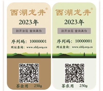 “專用標識分為‘證明標N(茶農(nóng)用)’和‘證明標Q(企業(yè)用)’兩種樣式,相當于西湖龍井茶的一張‘身份證’,上面包含了使用主體、年份、規(guī)格、編號、防偽信息等內(nèi)容?!本皡^(qū)執(zhí)法隊提醒,龍井茶大量上市時期,購買正宗西湖龍井需認準專用標識。