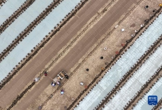 4月18日,唐山市豐南區(qū)西葛鎮(zhèn)的農(nóng)民在田間使用機(jī)械設(shè)備育秧(無人機(jī)照片)。