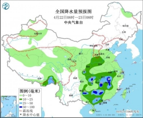 全國(guó)降水量預(yù)報(bào)圖(4月21日08時(shí)-22日08時(shí))