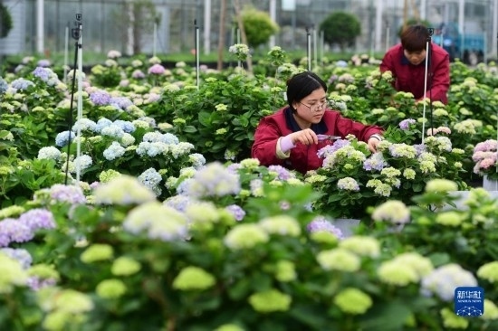 5月5日,在肥西縣經開區(qū)一家農林科技企業(yè),員工在花卉種植基地打理繡球花。