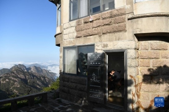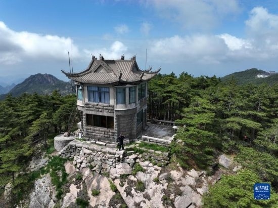 這是5月8日拍攝的黃山風景區(qū)平天矼瞭望哨(無人機照片)。
