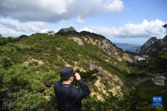 4月20日,秦志平在黃山風景區(qū)觀測山林。