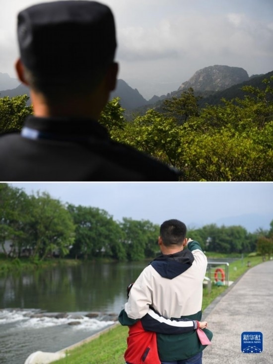 這是一張拼版照片。上圖:秦志平在黃山之巔俯視山腳,看向家的位置(5月8日攝);下圖:在安徽省黃山市黃山區(qū),休假中的秦志平(右)和女兒秦靖妍散步途中,指著黃山的方向,告訴女兒自己守護山林的故事(5月7日攝)。