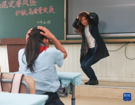 5月12日,沈陽(yáng)市北塔小學(xué)的老師為學(xué)生演示應(yīng)急避險(xiǎn)動(dòng)作。