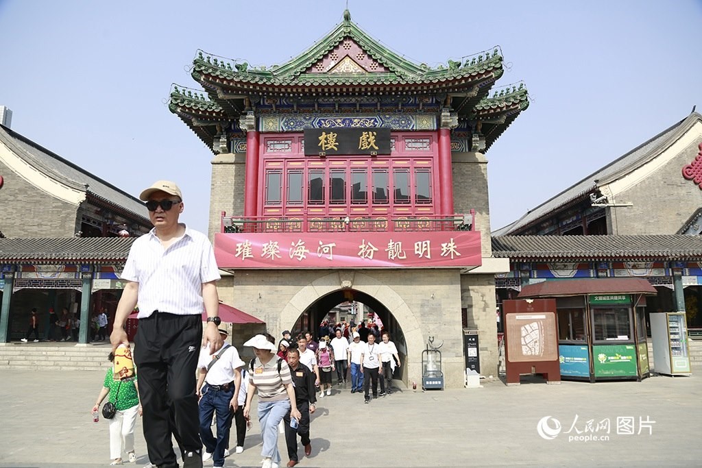 天津古文化街位于海河西岸,是國家5A級旅游景區(qū)、津門十景之一。5月16日,旅客從古文化街的戲樓走出。人民網(wǎng) 崔新耀攝