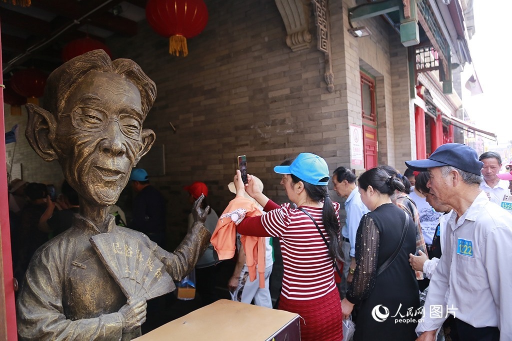 天津古文化街位于海河西岸,是國家5A級旅游景區(qū)、津門十景之一。5月16日,游客從相聲大師馬三立的雕塑旁走過。人民網(wǎng) 崔新耀攝