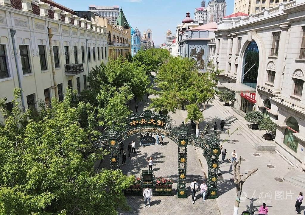 5月17日,游人漫步在哈爾濱市中央大街,感受百年老街的歐陸風(fēng)情,盡賞冰城的夏日風(fēng)光。人民網(wǎng) 蘇靖剛攝