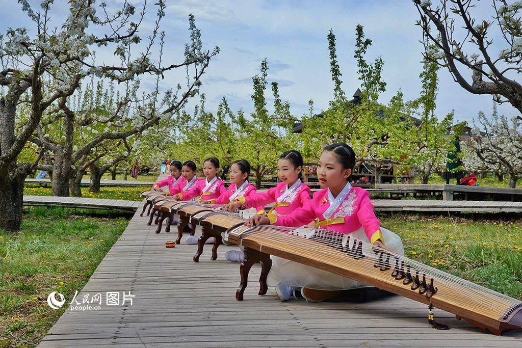 5月11日,吉林省延邊州龍井市萬畝梨園迎來梨花盛開期。在梨樹下孩子們彈琴賞花。人民網(wǎng) 李洋攝