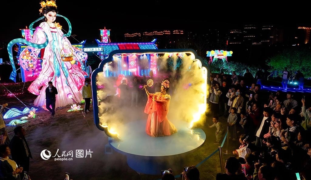 5月15日晚,山西太原晉陽湖桃花島,精彩的舞蹈演出和美輪美奐的燈組裝置吸引眾多游客觀賞。人民網(wǎng)記者 王帆攝