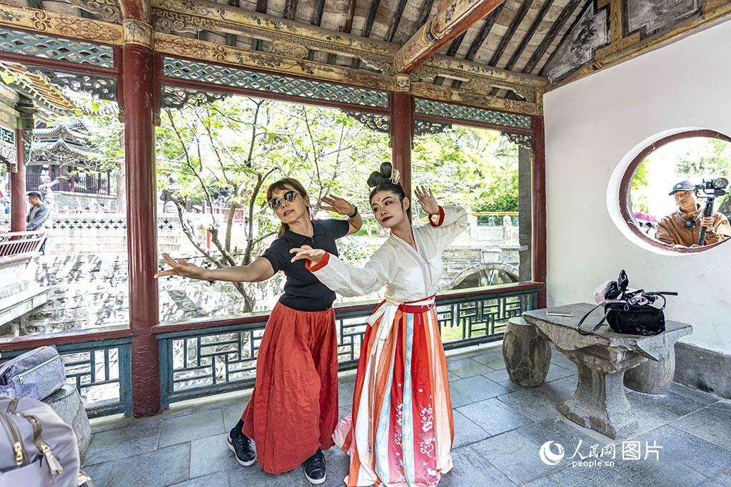 5月18日,游客在山西太原晉祠博物館與漢服演員一起合影。人民網(wǎng) 盧鵬宇攝