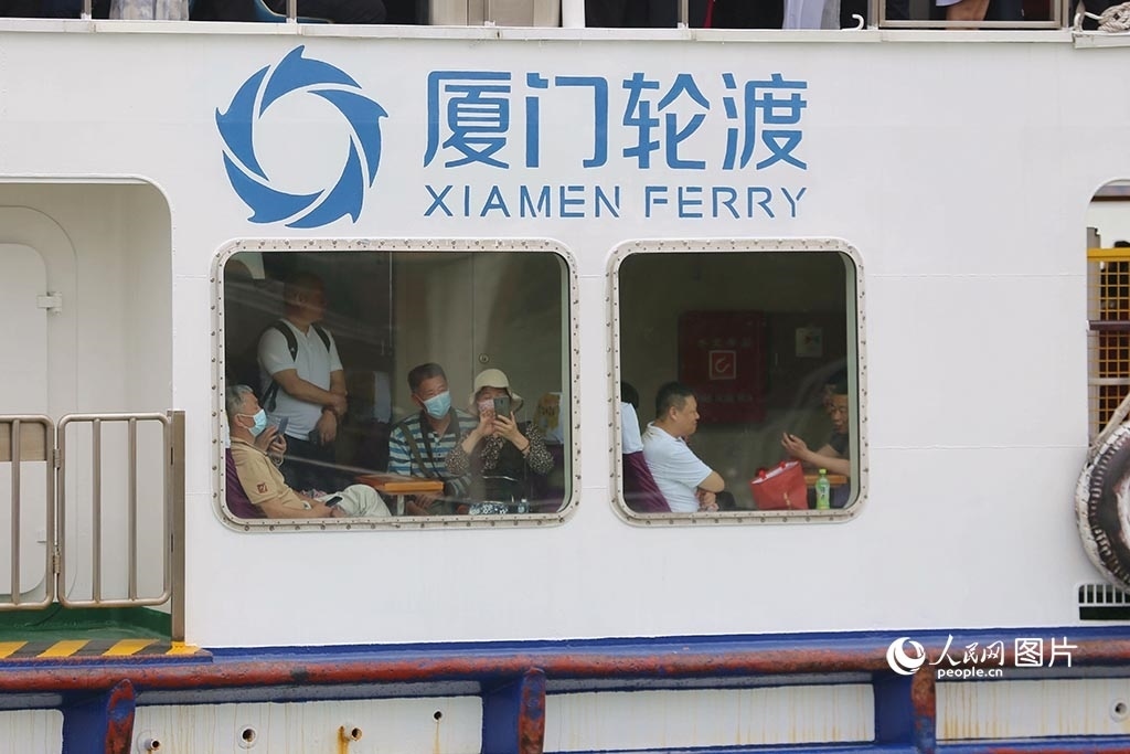 5月14日,廈門輪渡船停靠鼓浪嶼內(nèi)厝澳碼頭,船艙里的游客迫不及待地拿起手機(jī)拍照。人民網(wǎng)記者 陳博攝