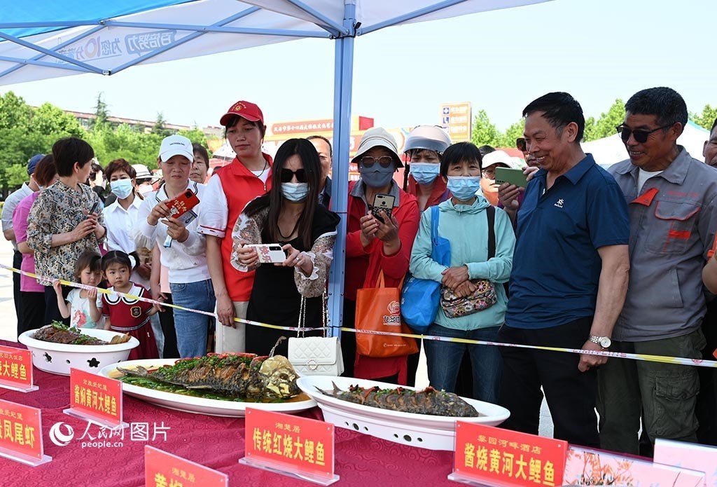 5月17日,“中國旅游日”主題周活動期間,河南省義馬市舉辦“櫻紅五月”美食節(jié),集中展示當(dāng)?shù)氐奶厣朗?、名?yōu)特產(chǎn),為了讓游客有更好的體驗,當(dāng)?shù)?2家飯店還進(jìn)行了精彩紛呈的廚藝大比拼?;顒蝇F(xiàn)場,游客在圍觀經(jīng)典豫菜“紅燒黃河大鯉魚”。人民網(wǎng)記者 王玉興攝