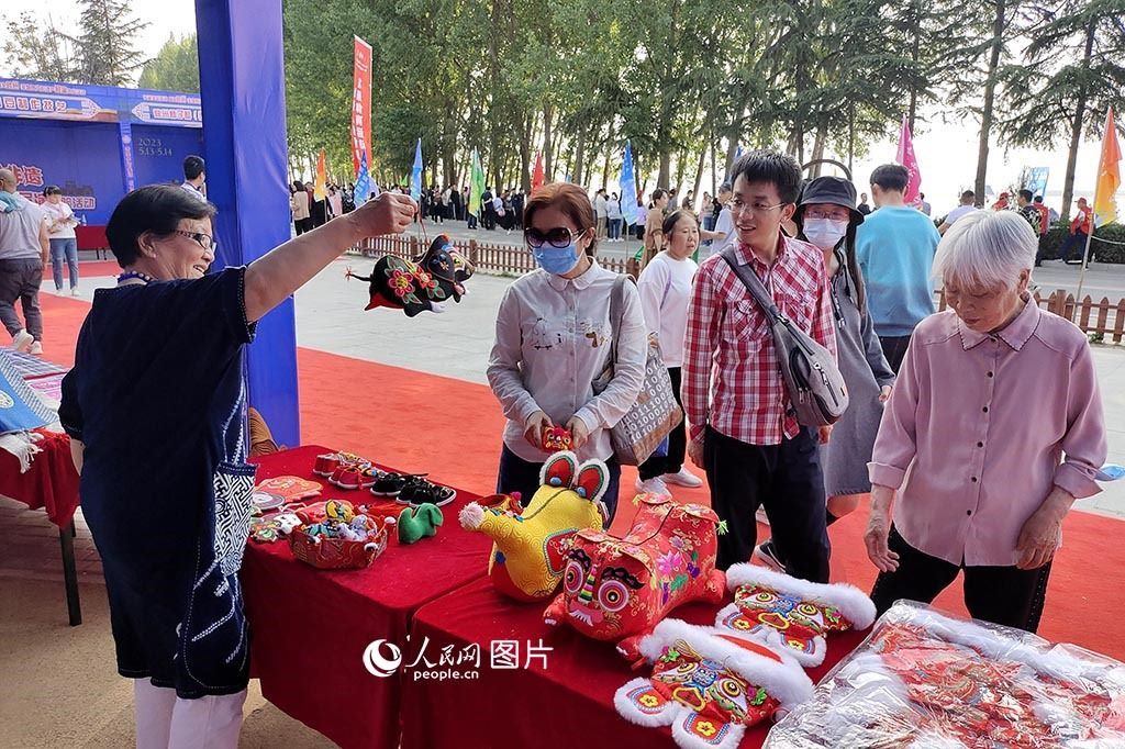 5月14日,“中國旅游日”主題周活動期間,河南省三門峽市陜州區(qū)在黃河岸邊舉辦“傳承多彩非遺”魅力陜州非物質(zhì)文化遺產(chǎn)展演體驗活動,大展傳統(tǒng)藝術(shù)魅力,為群眾獻(xiàn)上了一場“非遺文化盛宴”。在活動現(xiàn)場,當(dāng)?shù)厥〖壏沁z傳承人向游客展示文創(chuàng)產(chǎn)品布老虎。人民網(wǎng)記者 王玉興攝