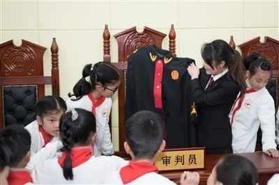 安源區(qū)法院“法之光”保護(hù)未成年人工作室的法官向?qū)W生講解法袍法徽知識。