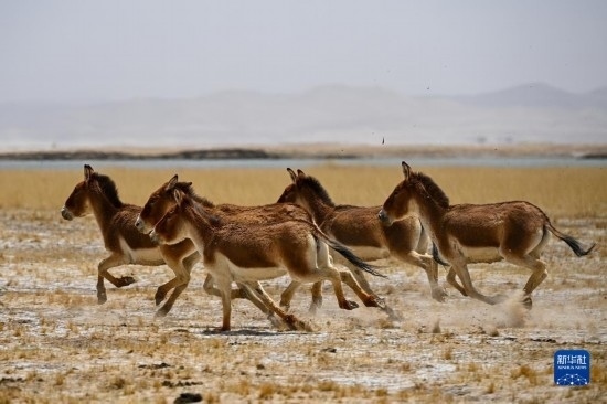 一群藏野驢在阿爾金山國(guó)家級(jí)自然保護(hù)區(qū)奔跑(5月23日攝)。