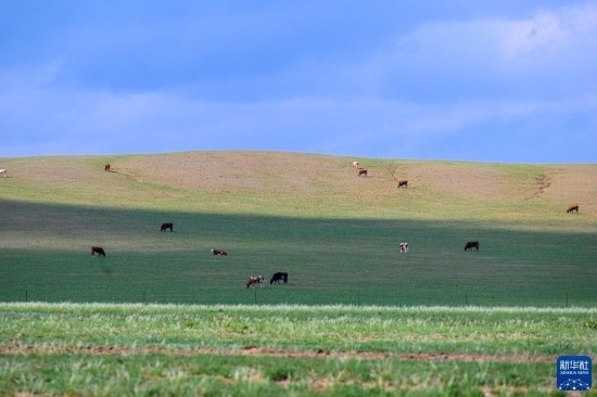5月30日,牛群在內(nèi)蒙古錫林郭勒盟蘇尼特右旗境內(nèi)的草原上悠閑覓食。