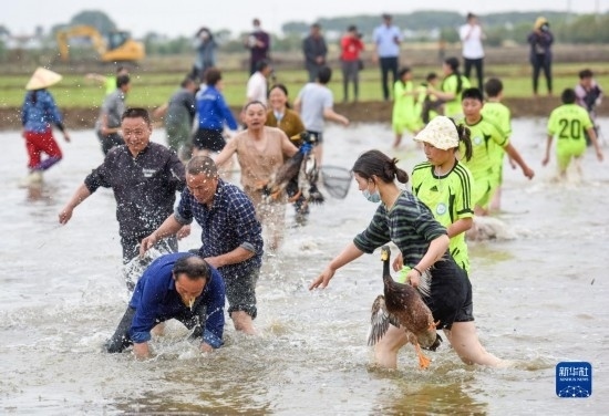 5月30日,在淮安市洪澤區(qū)岔河鎮(zhèn),人們?cè)诓逖砉?jié)上參加抓鴨比賽。