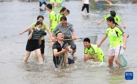 5月30日,在淮安市洪澤區(qū)岔河鎮(zhèn),人們?cè)诓逖砉?jié)上參加摸魚比賽(無人機(jī)照片)。
