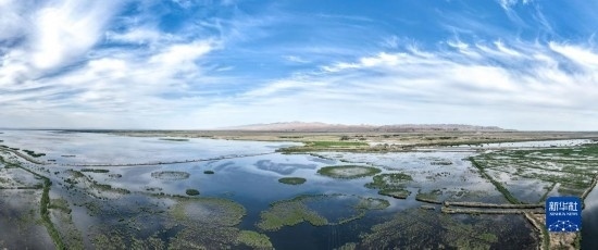 這是6月4日拍攝的位于內(nèi)蒙古巴彥淖爾市烏拉特前旗的烏梁素海(無人機全景照片)。