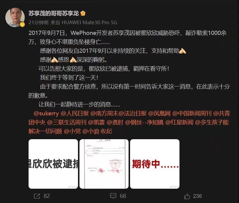 事發(fā)5年多之后,2023年6月9日,蘇享茂的哥哥蘇享龍通過個人微博稱,“翟欣欣已被逮捕,羈押在看守所?!碧K享龍?zhí)峁┑募由w北京海淀區(qū)公安局公章的立案通知書顯示,翟欣欣敲詐勒索一案,該局認為符合立案條件,現(xiàn)立案偵查。