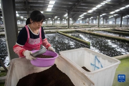 6月7日,中國清江(宜都)鱘魚谷工作人員在準(zhǔn)備鱘魚餌料。