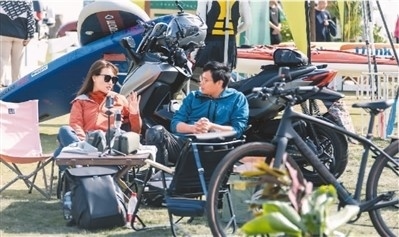 2023淀山湖(昆山)國際露營節(jié)在江蘇省昆山市舉行。露營節(jié)涵蓋露營裝備展、飛盤活動(dòng)以及露營派對(duì)等內(nèi)容,滿足露營愛好者的多樣需求。圖為兩名游客在露營裝備展區(qū)交流。唐旭騁攝(人民視覺)