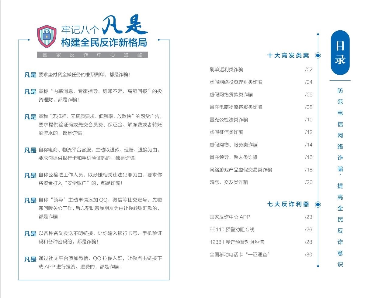 人民網(wǎng)北京6月16日電 (記者郝萍、梁秋坪)按照中央宣傳部、公安部聯(lián)合部署開展的“全民反詐在行動”集中宣傳月活動有關要求,國家反詐中心編寫制作并最新推出《2023版防范電信網(wǎng)絡詐騙宣傳手冊》(以下簡稱《手冊》),詳細梳理10類高發(fā)電信網(wǎng)絡詐騙案件特點和詐騙手法,深入介紹7大反詐利器的主要功能和使用方法,進一步擴大反詐宣傳覆蓋面,提升廣大群眾識騙防騙意識和能力。
