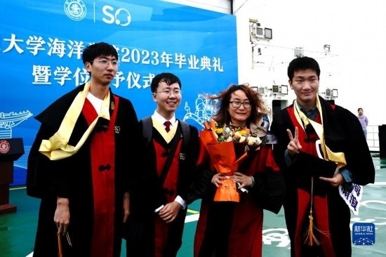 當日,上海交通大學海洋學院2023年畢業(yè)典禮暨學位授予儀式在“雪龍2”號上舉行,70余名畢業(yè)生在甲板上與師長道別?!把?”號是我國自主建造的第一艘極地科學考察破冰船。