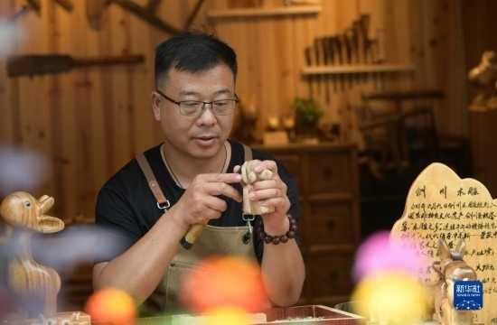6月17日,一名手工藝人在貴州省鎮(zhèn)遠(yuǎn)古城一家木雕店雕刻工藝品。