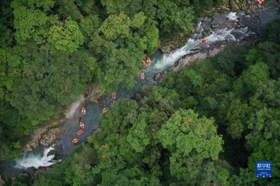 6月17日,游客在鎮(zhèn)遠(yuǎn)縣高過(guò)河景區(qū)漂流(無(wú)人機(jī)照片)。