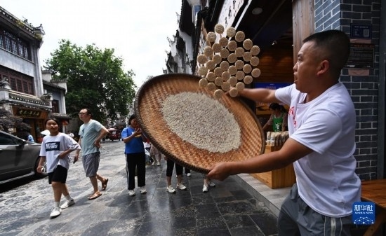 6月17日,一名商販在鎮(zhèn)遠(yuǎn)古城加工苗家蝴蝶餅。