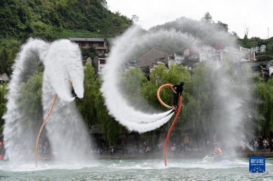 6月17日,工作人員在鎮(zhèn)遠(yuǎn)古城 陽(yáng)河畔進(jìn)行水上飛人表演。