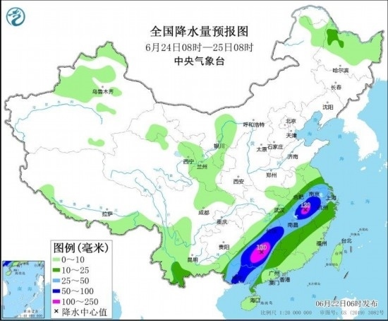 6月24日08時(shí)至25日08時(shí),廣西中東部、廣東西北部、湖南南部和東部、江西中北部、安徽南部、江蘇南部、上海、浙江西部等地部分地區(qū)有大到暴雨,其中,廣西東北部、湖南南部、安徽南部等地局地有大暴雨(100~180毫米)(見圖5)。
