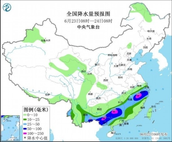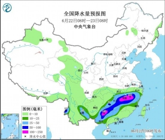 6月22日08時(shí)至23日08時(shí),貴州東南部、云南東部和西北部、廣西中部和東北部、廣東北部、湖南南部和東部、江西中北部、浙江南部、福建北部等地有大到暴雨,其中,廣西東北部、江西中部、福建西北部等地部分地區(qū)有大暴雨(100~200毫米)。新疆南疆盆地部分地區(qū)有4~5級風(fēng)(見圖3)。