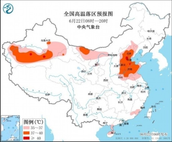 圖2 全國高溫落區(qū)預(yù)報(bào)(6月22日08時(shí)-20時(shí)) 圖自中央氣象臺(tái)網(wǎng)站