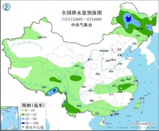 全國降水量預(yù)報圖(7月5日08時-6日08時)。圖片來源:中央氣象臺網(wǎng)站