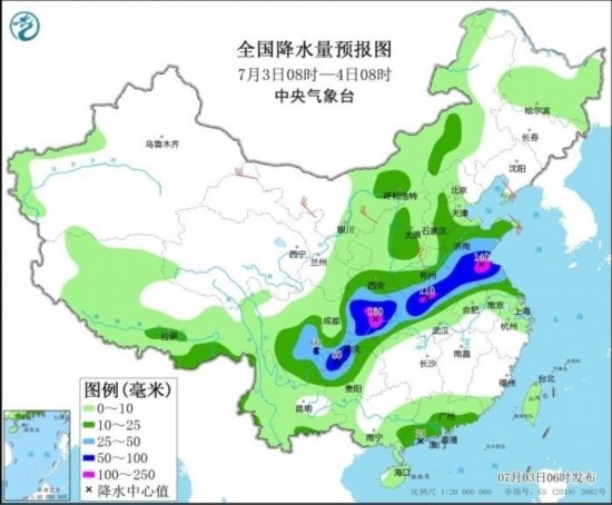 中央氣象臺7月3日06時繼續(xù)發(fā)布暴雨藍色預(yù)警:預(yù)計,7月3日08時至4日08時,山東中南部、江蘇北部、安徽北部、河南東部和南部、湖北北部和西部、陜西南部、重慶、四川東部、貴州西北部、云南東北部以及廣東西南部沿海等地部分地區(qū)有大到暴雨,其中,山東南部、江蘇北部、河南南部、重慶北部、四川東北部等地局地有大暴雨(100~160毫米)。上述部分地區(qū)伴有短時強降水(最大小時降雨量30~50毫米,局地可超過60毫米),局地有雷暴大風(fēng)等強對流天氣。